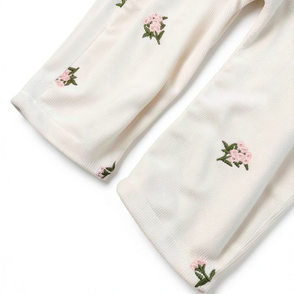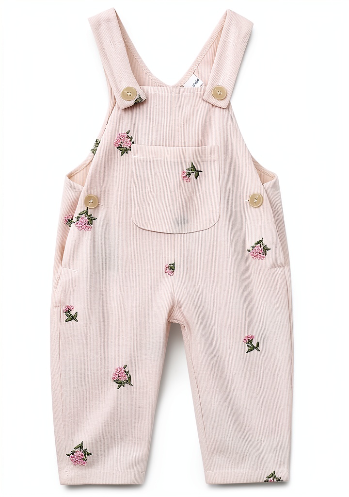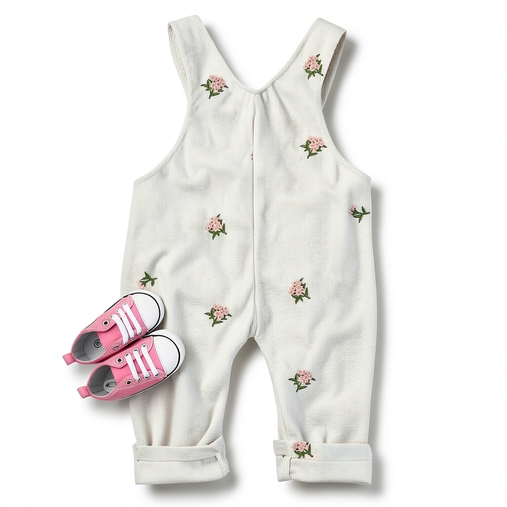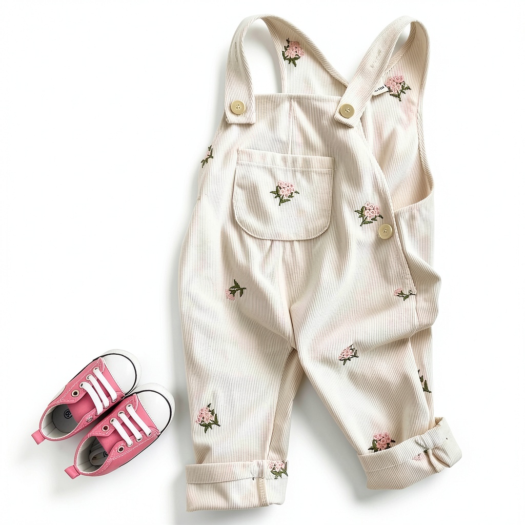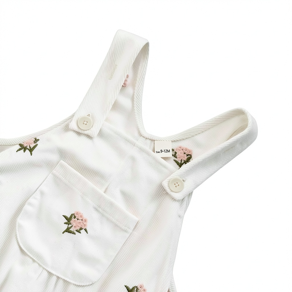 - Cute floral embroidery on soft corduroy for a charming, photo-ready appearance